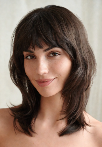 Feathery layers add instant fullness and bounce with minimal effort. Light, airy bangs soften your look without the commitment of heavy fringe — perfect for busy moms who want low-maintenance style. The extra layers create natural texture and movement, keeping your hair fresh, light, and easy every day.