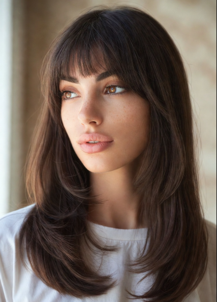This haircut strikes the perfect balance between simple and stylish. Long, sleek layers create smooth movement and a polished feel, while straight-across bangs add a modern contrast and fresh, on-trend edge.