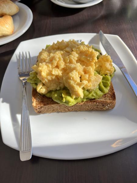 - Baked sweet potato topped with leafy greens, black beans, and avocado-cilantro dressing